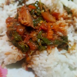 VEGETABLE SAUCE WITH WHITE RICE(CHICKEN/TURKEY/GOATMEAT/CROAKER)