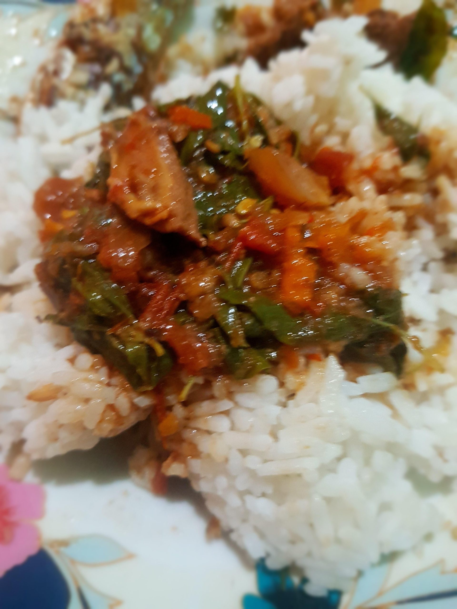 VEGETABLE SAUCE WITH WHITE RICE(CHICKEN/TURKEY/GOATMEAT/CROAKER)